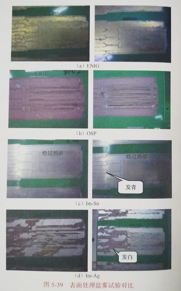 在常规的盐雾试验要求情况下,OSP、Im-Ag、ENIG的抗盐雾能力都比较差,只有Im-Sn并热熔处理的表面比较好,没有看见明显的腐蚀现象,如图5-39所示。